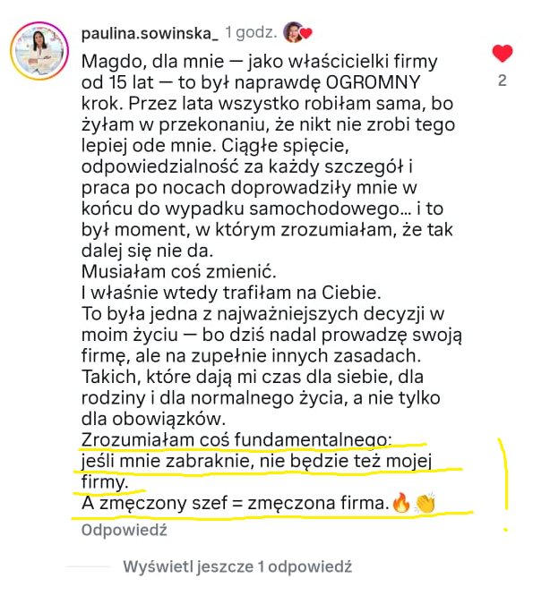To był wspaniały rajd najpiękniejszymi drogami z najlepszym pilotem kierującym tą podróżą 🚗✨. Ten proces, ta droga spowodowały przemianę mojego myślenia i mojej osoby o 180 stopni! Jestem spokojniejsza, bardziej wyrozumiała dla siebie, rozumiem, że nie trzeba robić wszystkiego na 1000%, 80% wystarczy i czas dla siebie jest najważniejszy, bo jak nie zadbam o siebie nie będę miała siły na zaopiekowanie się resztą!🧘♀️💖. Dziękuję za kroki milowe do naszego celu, za instrukcje na pożary i na zalążki trudnych sytuacji w Zespole i w życiu ❤️. Za wszystkie momenty “Aha” i emocje, które pomogły stworzyć więź 🤝. Polecam z całego serca Magdę, bo jest najlepszą ekspertką w swoim fachu ❤️. Potrafi działać cuda i zmieniać życie na lepsze!! Dziękuję, dziękuję, dziękuję 🙏.
